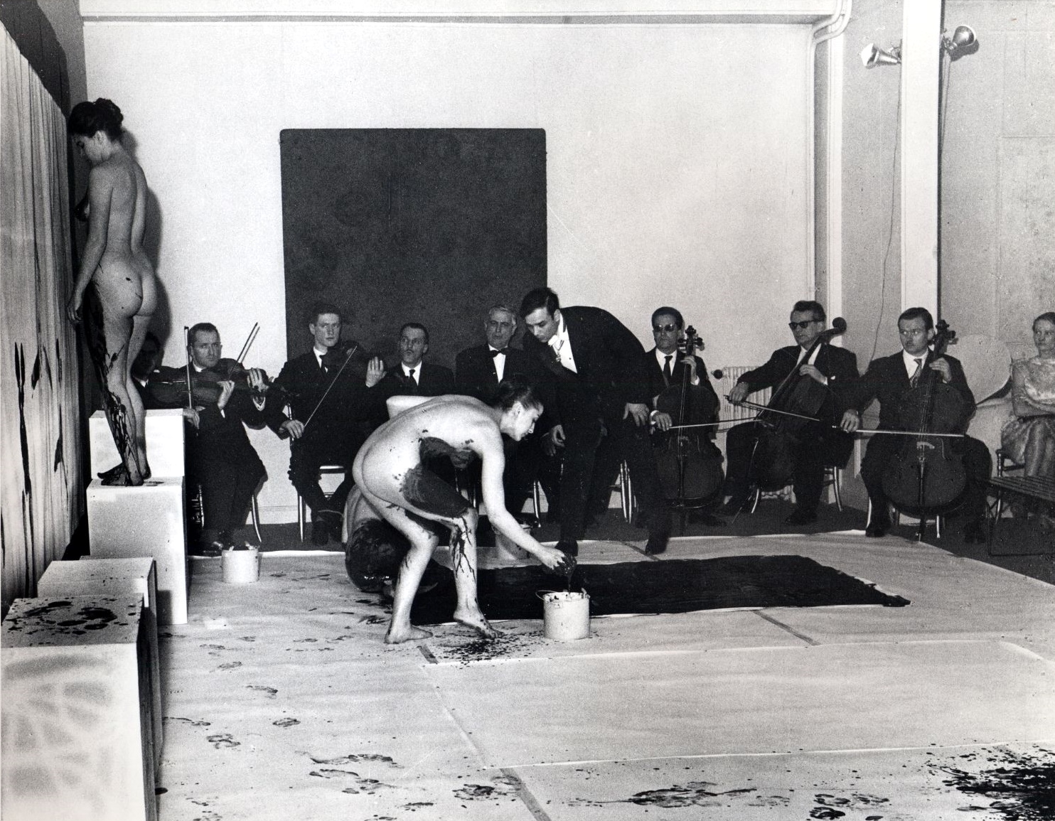 Yves Klein explore l’univers musical en 1947 en devenant chef d’orchestre de sa propre symphonie Monoton-Silence. Une symphonie de quarante minutes durant laquelle une seule note est jouée avant de s’achever en un silence vertigineux. Cette expérience témoigne de la volonté permanente de Klein d’approfondir l’immatériel, l’impalpable, le vide. Cette symphonie est ainsi jouée lors de la performance des Anthropométries*. Chanteurs, violonistes, contrebassistes et bien d’autres musiciens tiennent une seule et unique note : le ré… pendant quarante minutes. Les Anthropométries sont des performances lors desquelles des modèles féminins sont enduits d’une peinture bleue et viennent recouvrir un support de leur corps par la suite Il appelle ses modèles à plonger leurs corps nus dans sa fameuse peinture bleue, l’IKB, puis à les appliquer sur de grandes toiles. De cette façon, l’artiste se met à distance de la peinture et utilise les corps d’autres personnes pour laisser son empreinte artistique. A l’époque, dans un climat encore loin de la libération sexuelle, les pinceaux vivants de Klein sont considérés comme une véritable provocation et ont l’effet d’un coup de point dans le monde de l’art. Avec cette pratique, Yves Klein s’impose en précurseur de la performance artistique. Video (site de l'INA) et sur You tube symphonie monotonale