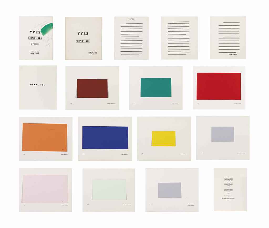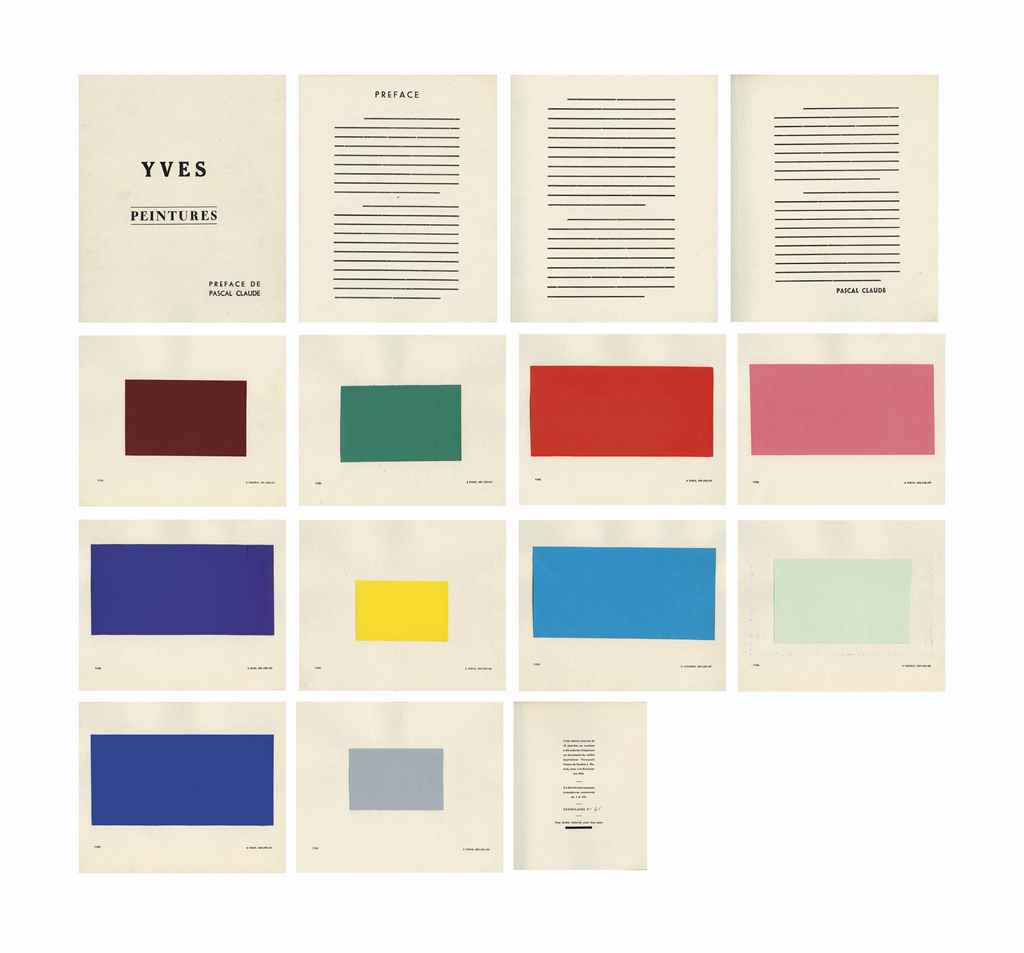 La première présentation publique des œuvres de Klein est la publication du livre d'artiste « Yves Peintures » paru le 18 novembre 1954 le livre présente une série d'intenses monochromes en relation avec diverses villes où il avait vécu pendant les années précédentes. La préface de Yves Peintures est composée de lignes noires à la place du texte. Les dix planches en couleurs sont constituées de rectangles unicolores découpés dans du papier, datés et accompagnés de dimensions en millimètres. Chaque planche indique un lieu différent de création : Madrid, Nice, Tokyo, Londres, Paris.
