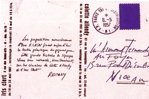KLEIN Yves 1958 Carte postale - invitation