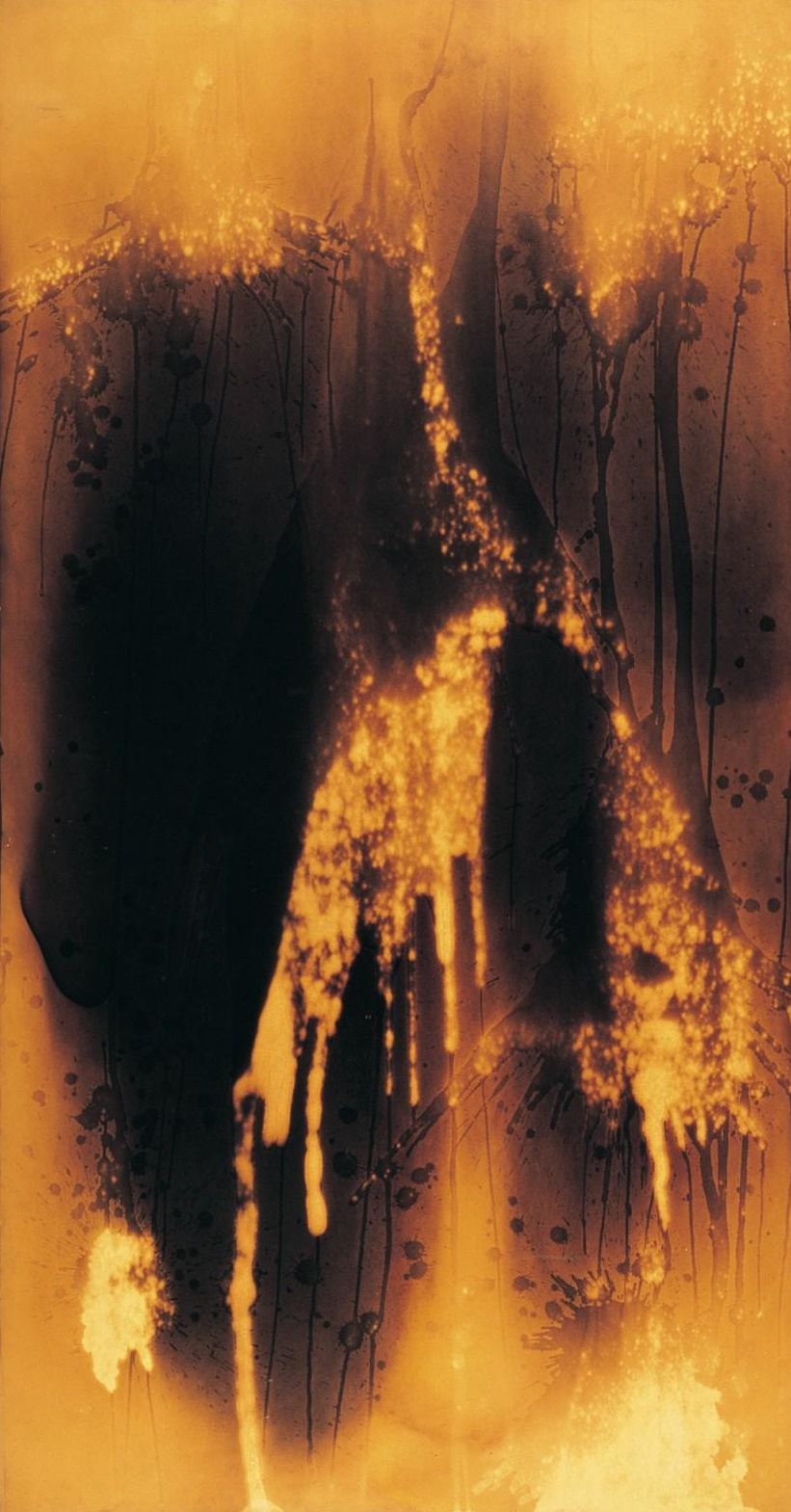 La fièvre créatrice d’Yves Klein est sans limite, et il ne se contente pas d’explorer la couleur ou le vide. Profondément marqué par des photographies d’Hiroshima, sur lesquelles on devine les empreintes des corps des victimes, Yves Klein initie sa série Peinture de feu au début de l’année 1961 : il y cherche à imprimer les traces du feu sur divers supports. C’est au Centre d’essais de Gaz de France de la Plaine Saint-Denis, où on met à sa disposition un équipement industriel, qu’il apprend à maîtriser le feu et à effectuer des réglages précis pour en utiliser les différents degrés de puissance. Il réalise ainsi, encadré par des pompiers, des tableaux « peints » au lance-flamme. Après le corps féminin, c’est le feu qui lui sert de pinceau dans sa quête vers l’exploration de l’immatérialité.