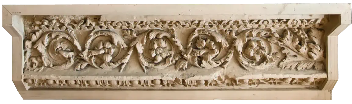 Bandeau de faible largeur peint ou sculpté qui décore le haut d'un édifice, le mur d'une pièce ou une partie d'un objet quelconque.